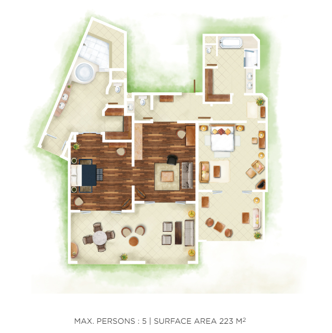 Образуется объединением двух номеров категории Junior Suite, 2 спальни, 2 ванные комнаты с ванной и душем, 2 террасы;