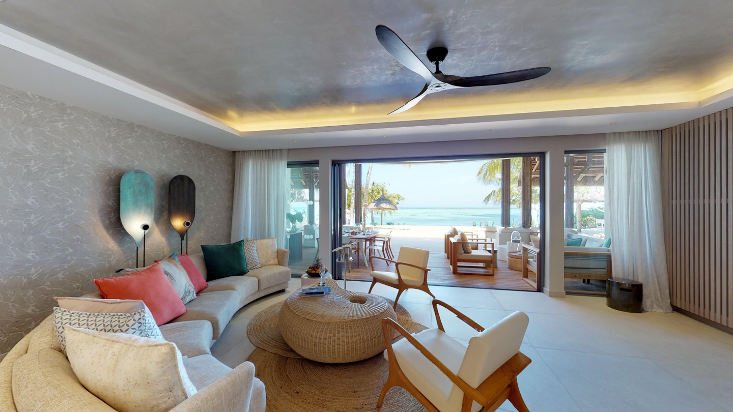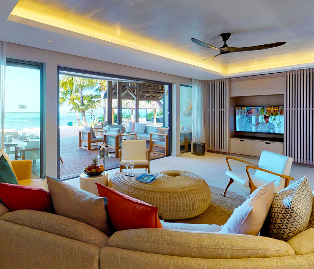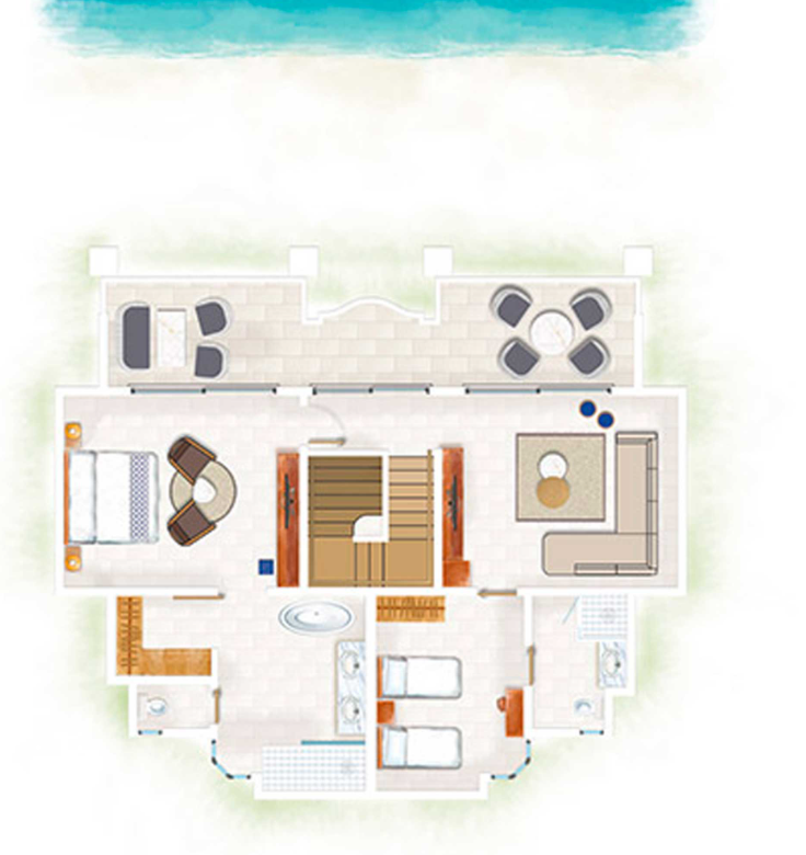 Двухэтажная вилла на пляже, 4 спальни (3 комнаты с двуспальными кроватями, одна с 2 отдельными кроватями), 4 ванные комнаты с душем под открытым небом, отдельная гостиная комната с диваном и домашним кинотеатром, полностью оборудованная кухня, балкон, просторная терраса с зоной отдыха и обеденным столом, частный сад, 2 беседки, услуги персонального дворецкого, вид на лагуну, клубный автомобиль, услуги шеф-повара (запрос), приветственные подарки, кофемашина и частный шезлонг на пляже.