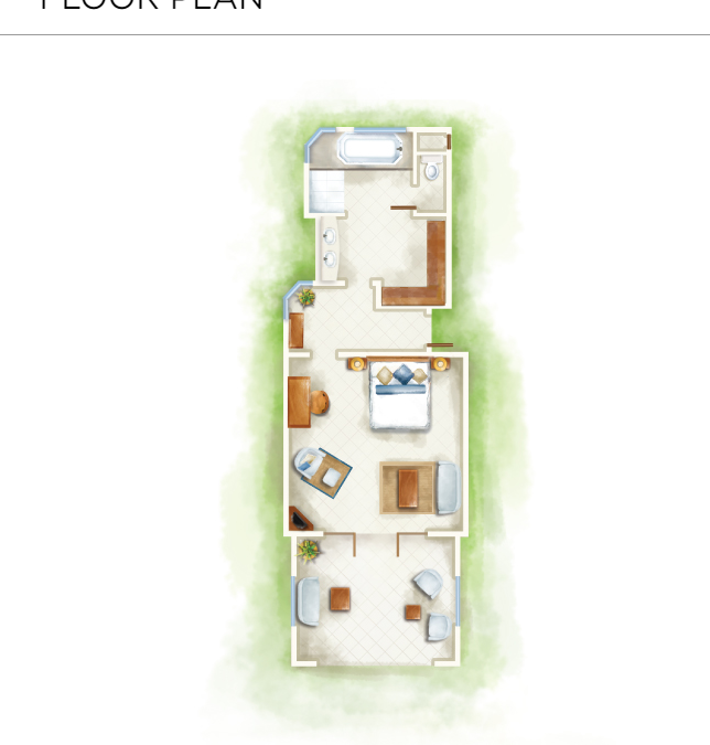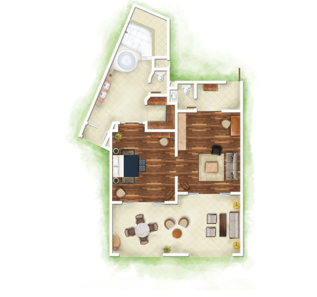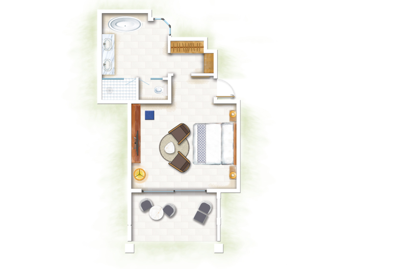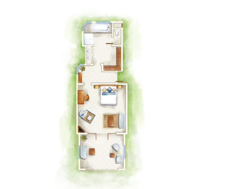Расположенный в центральной части отеля среди живописных тропических садов. Находятся на первом этаже (ground floor), двуспальная кровать, гостиная зона с креслом, ванная комната с ванной и душем, терраса;