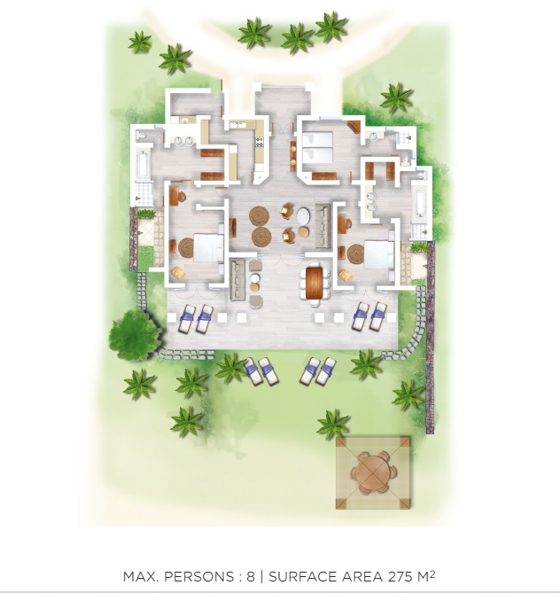 Расположены у пляжа, прямой выъод на пляж и частный сад, 3 спальни: 2 двуспальные кровати и 2 односпальные кровати, 3 ванные комнаты (одна из них только с душем, в двух ванных комнатах также есть душ на открытом воздухе, расположенный в миниатюрном саду), отдельная гостинай комната с диваном и домашним кинотеатром, полностью оборудованная кухня, терраса с зоной отдыха и обеденным столом, беседка, услуги личного повара (по запросу), услуги частного парковщика и гольф-кар, приветственные подарки, кофемашина и частный шезлонг на пляже;