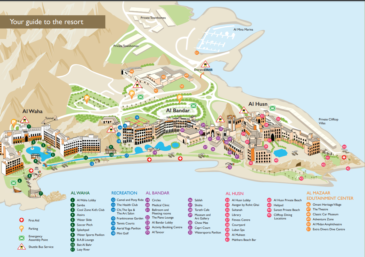 Отель является частью курортного комплекса Shangri-La Barr Al Jissah Resort & Spa. В комплекс входят 3 отеля: Al Waha, Al Bandar и Al Husn. Гости отелей Al Waha и Al Bandar не могут пользоваться территорией и инфраструктурой отеля Shangri-La Al Husn Resort And Spa.