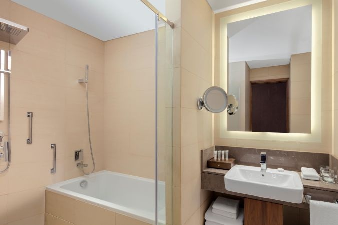 В номерах: фен, халат, банные принадлежности, телефон, телевизор со спутниковыми каналами, Wi-Fi, рабочий стол, кондиционер, сейф, мини-бар.