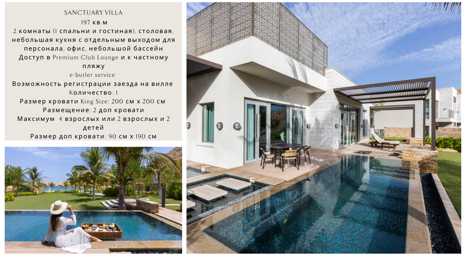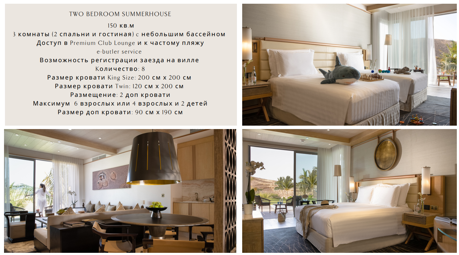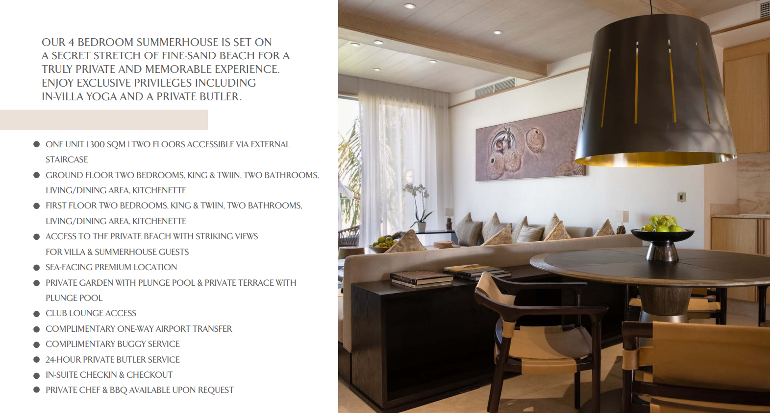 Двухэтажная вилла, 4 спальни: 2 спальни с двуспальными кроватями king-size и 2 спальни с 2 односпальными кроватями, 2 гостиные комнаты и 2 обеденные зоны (на каждом этаже по комнате), ванные комнаты, большая терраса и 2 частных небольших бассейна, частный пляж, вид на океан и пляж, услуги консьержа круглосуточно, с правом посещения клубного лаунжа, регистрация заезда и выезда на вилле, вечерние аперитивы и закуски в номере, бесплатный трансфер из аэропорта в одну сторону, бесплатный гольф-багги, см.описание и фото.
