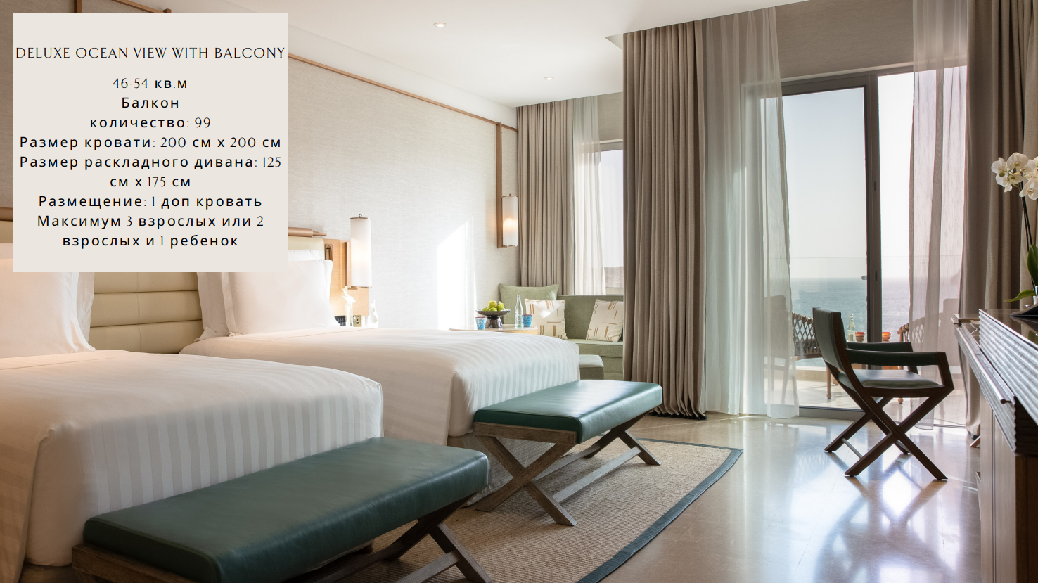- 99 номеров Deluxe Ocean Room with Balcony (46-54 м², макс. 3 чел.).