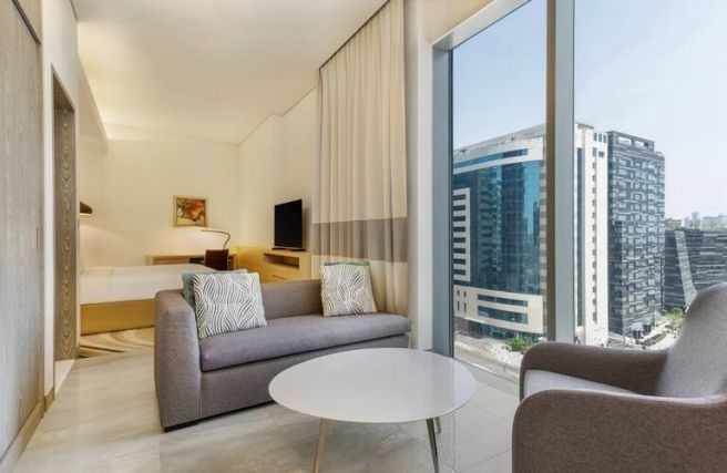Отель предлагает стильные номера с современными удобствами, панорамными видами на город или Аравийский залив, бассейн на крыше, сауну, фитнес-центр и фирменное печенье DoubleTree Cookie при заселении.