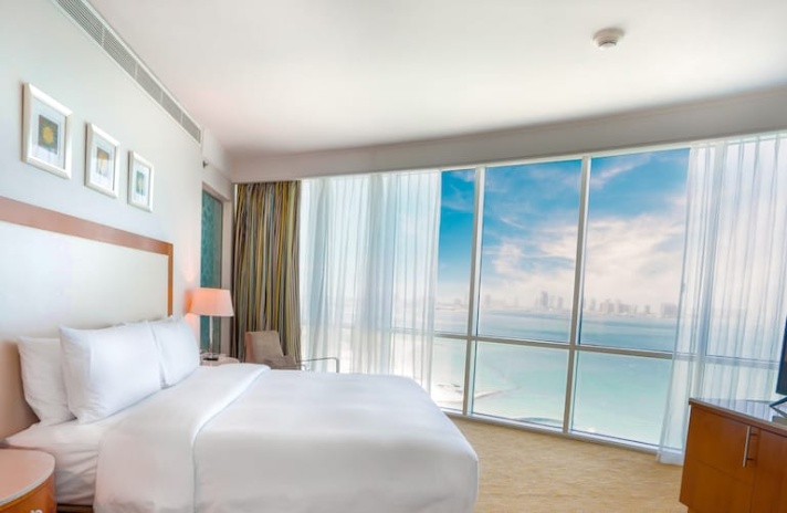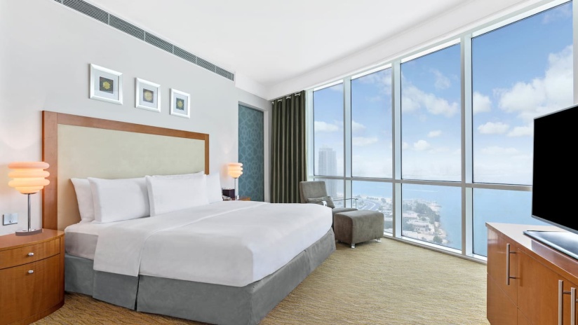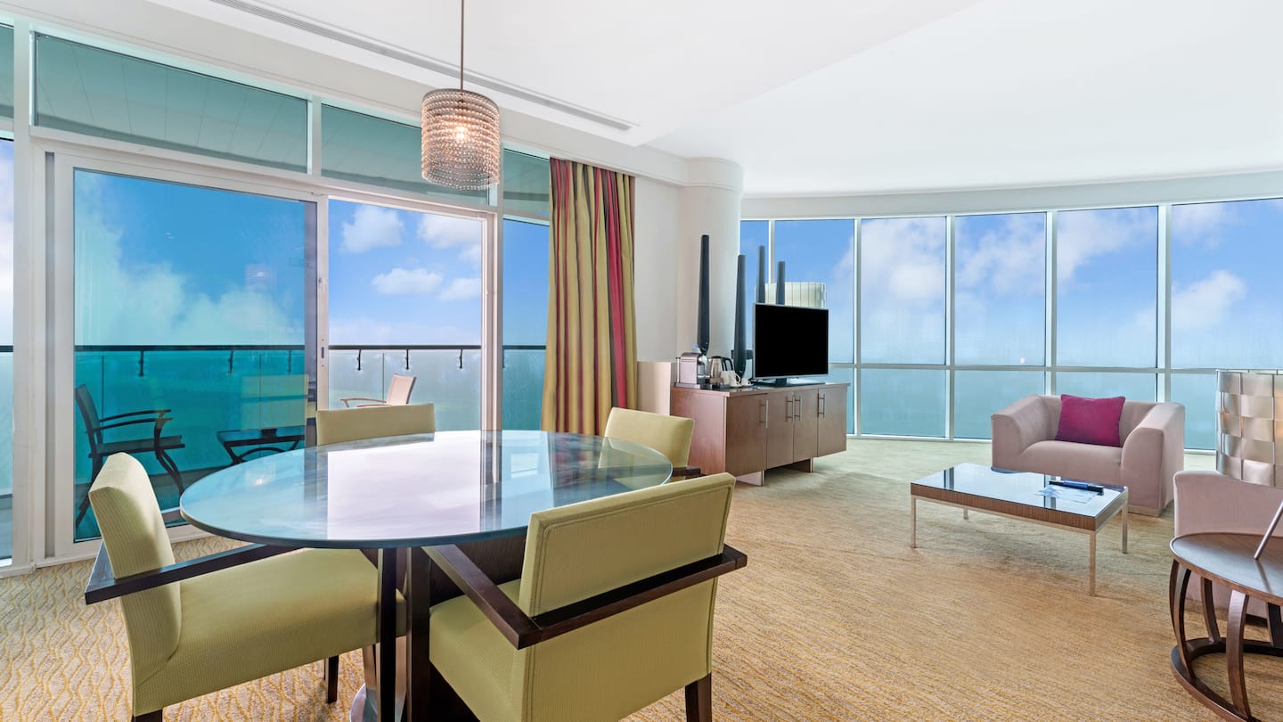 2 спальни: двуспальная кровать king-size и двуспальная кровать queen-size, отдельная гостиная комната с диваном и обеденным столом, мини-кухня, 2 ванные комнаты (есть гидромассажная ванна), окна от пола до потолка, панорамный вид на океан, доступ в эксклюзивный лаунж-клуб, где сервируется бесплатный завтрак и подаются вечерние напитки.