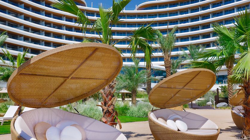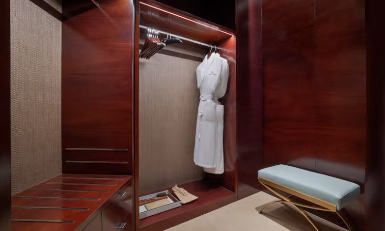 Спальня с двуспальной кроватью king-size, гостиная комната с диваном и обеденным столом, окна от пола до потолка, ванная комната с ванной и душем, гостевой туалет, гардеробная, балкон площадью 50 м² изогнутой формой предлагая зону для отдыха с видами на Аравийский залив;