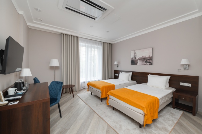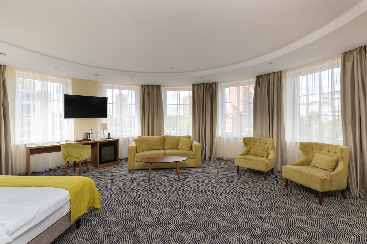 В номерах: Wi-Fi, сейф, телевизор, телефон, прикроватные тумбочки, шкаф, мини-бар, прикроватные тумбы.