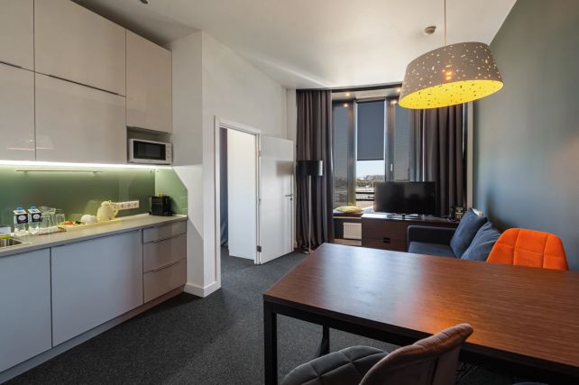 В номерах: рабочая зона, кондиционер, холодильник, телевизор, Wi-Fi, сейф, средства гигиены, фен, набор для приготовления чая и кофе, тапочки.
