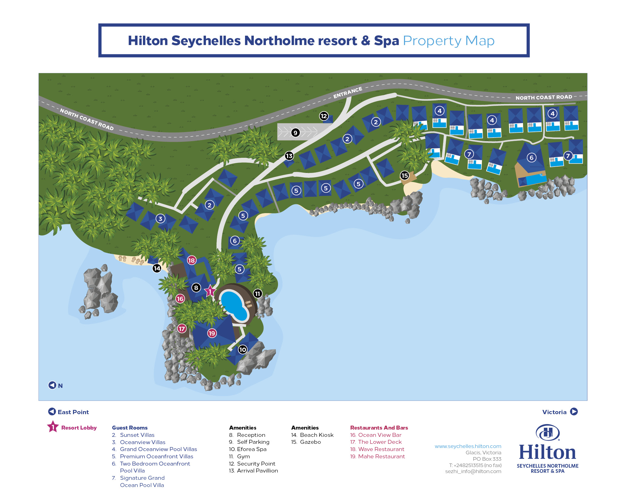 Hilton Seychelles Northolme Resort & Spa – отель для взрослых (13+) на северо-западе острова Маэ. Благодаря удачному расположению отель представляет собой одно из лучших мест для наблюдения закатов – из любой точки открывается вид на океан. К услугам гостей 56 вилл, 2 ресторана и 2 бара, спа-центр, небольшой песчаный пляж, обрамлённых гранитными скалами. Большинство используемых в приготовлении трав, специй, овощей и фруктов выращивается прямо здесь, в саду отеля
