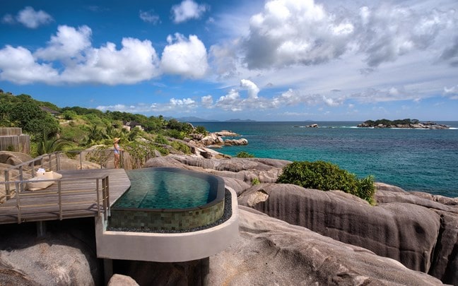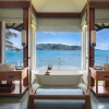 Расположены на побережье океана в восточной и западной части курорта, в отличие от Panorama Pool Villa - виллы Ocean Front Pool Villa расположены ниже на склоне холма, двуспальная кровать, гостиная зона с кушеткой, зона гардеробной, ванная комната с ванной и душевой кабиной, просторная терраса с шезлонгами и обеденной зоной, душ под открытым небом, персональный бассейн (20 м²) с вмонтированной кроватью, вид на океан, план номера;