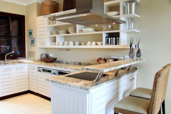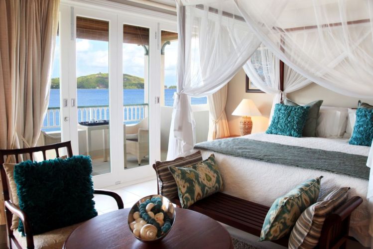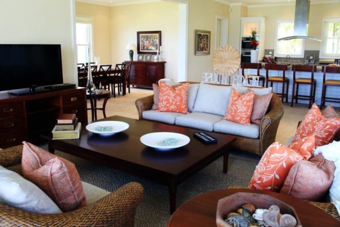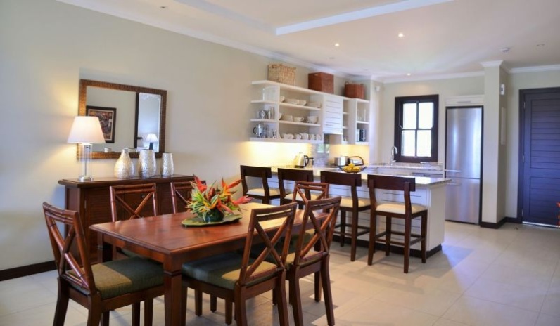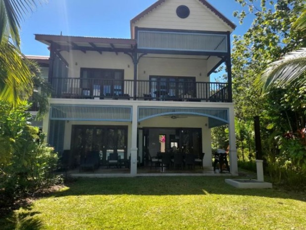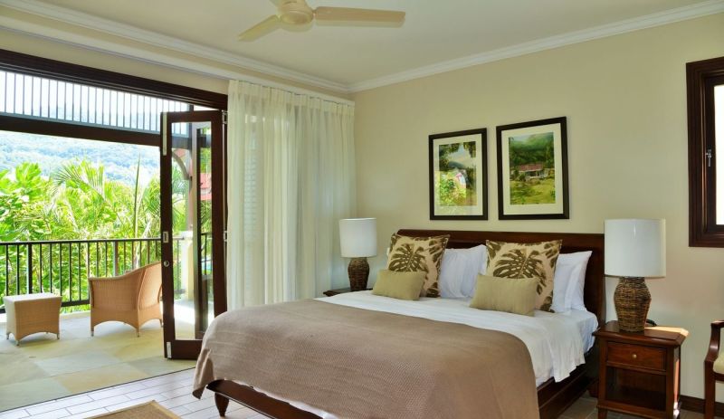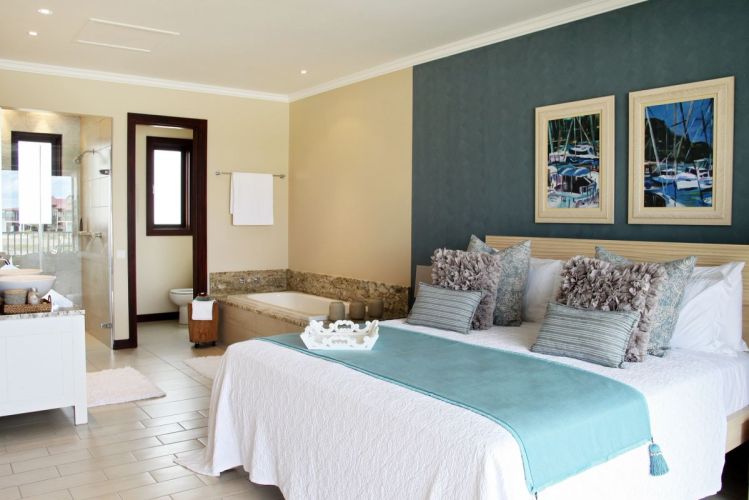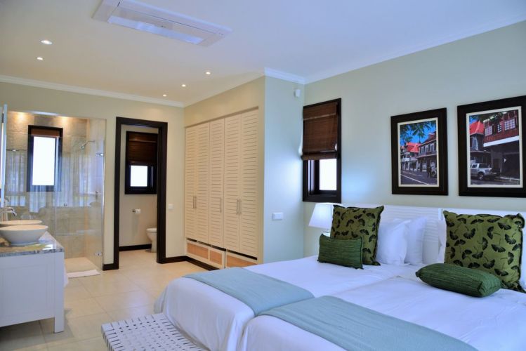 2 спальни: двуспальная и 2 односпальные кровати, отдельная гостиная комната с диваном и кухней, 2 ванные комнаты с душем, балкон или терраса, вид на пристань, горы или пляж, крытая веранда с барбекю грилем и гольф кар для передвижений по острову;