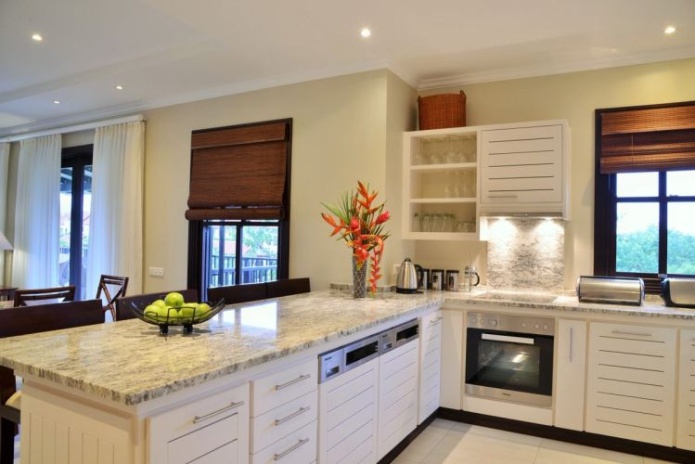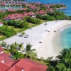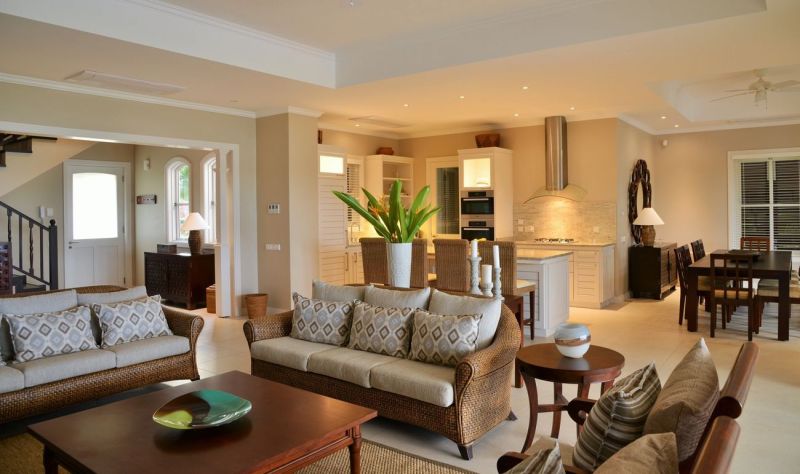 3 спальни, 3 ванные комнаты с душем, отдельная гостиная комната с диваном и кухней, балкон или терраса, вид на пристань, горы или пляж, крытая веранда с барбекю грилем и гольф кар для передвижений по острову;