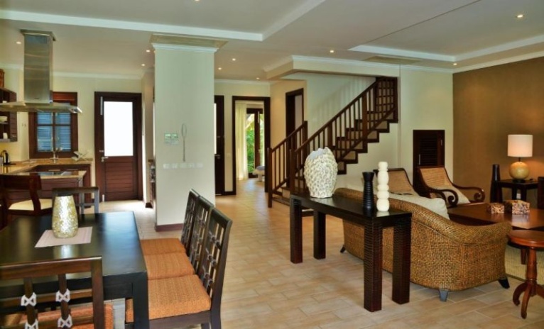 Двухуровневые дома, 3 спальни, 3 ванные комнаты с душем, отдельная гостиная комната с полностью оборудованной кухней, балкон, большая веранда с барбекю грилем, а также гольф кар для передвижений по острову, каждый коттедж расположен на отдельном участке, окружен садом и имеет выход на пристань;