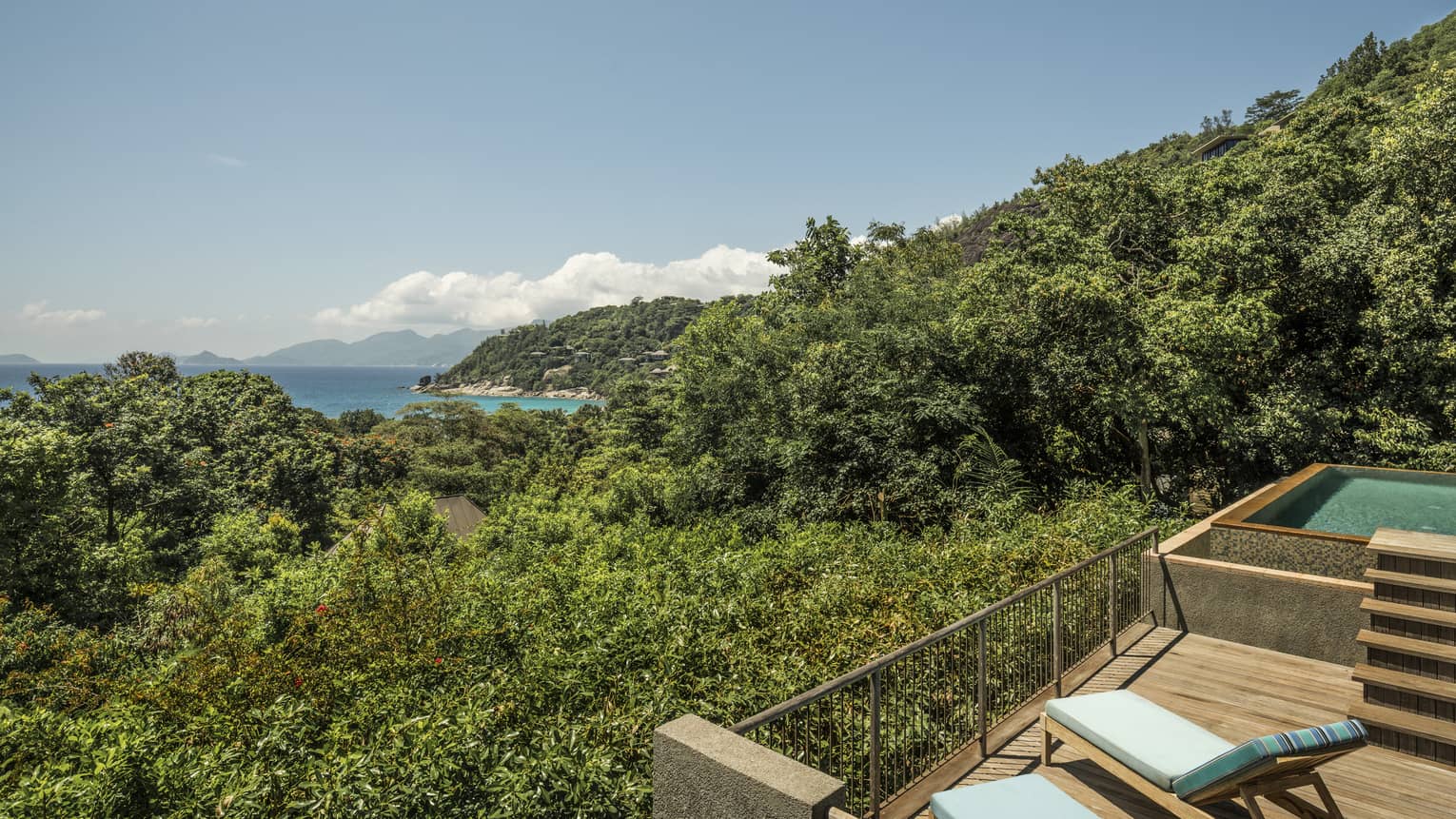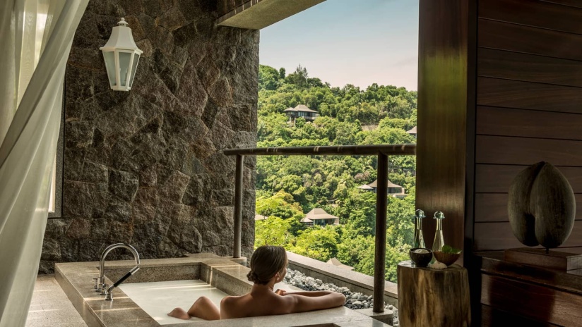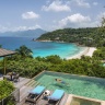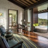 Номера расположены на холме, двуспальная кровать king-size, гостиная зона с диваном, ванная комната с ванной и душем, душ под открытым небом, гареробная, терраса, небольшой персональный бассейн, панорамный вид на океан, план номера;