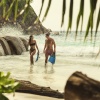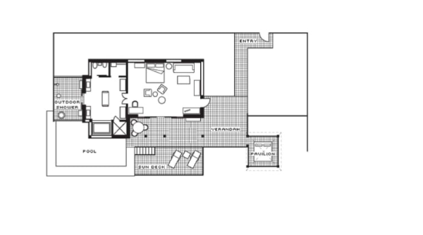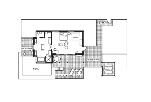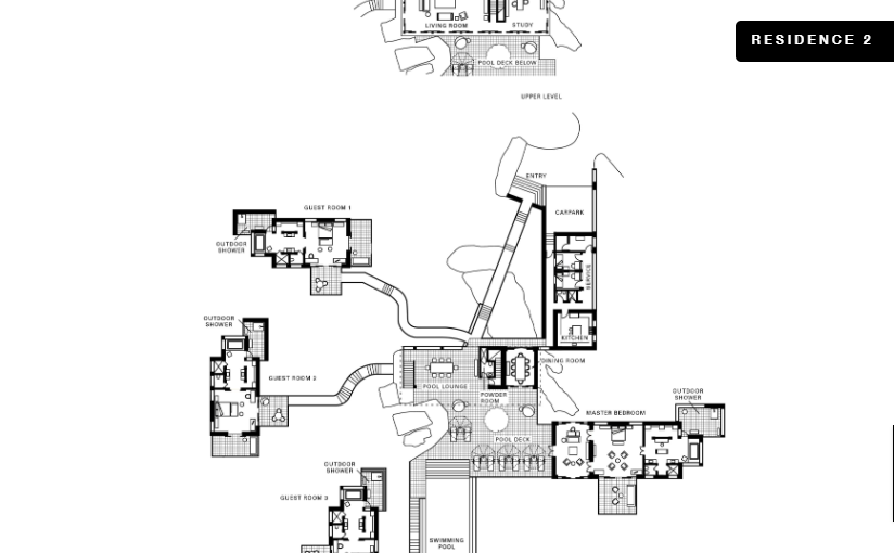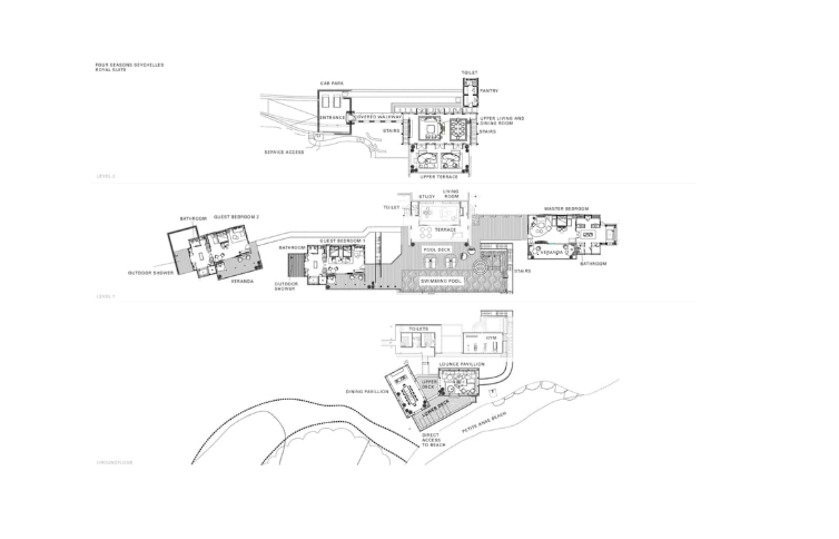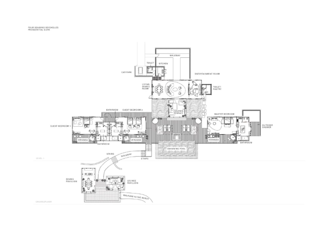 Двухуровневый номер с прямым выходом на пляж, 3 спальни: 2 двуспальные кровати king-size и 2 раздельные кровати размера queen-size, дополнительно 3 двиана-софа, отдельная гостиная комната с диваном, 3 ванные комнаты, 3 душа под открытым небом, гостевая ванная комната, частный тренажерный зал, отдельный кабинет, персональный бассейн (20 м), открытые обеденный павильон и павильон для отдыха, бесплатные коктейли у бассейна подаются ежедневно,терраса с лежаками, вид на пляж, океан и лес, план номера;