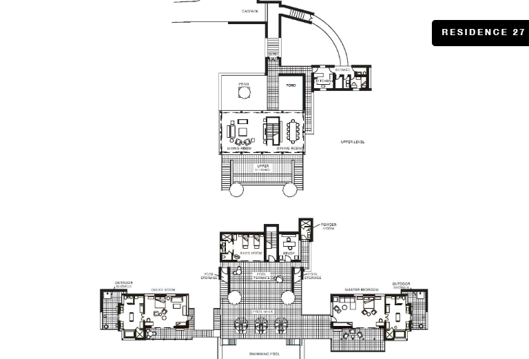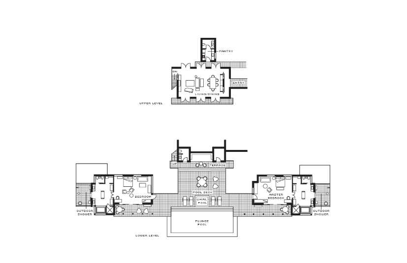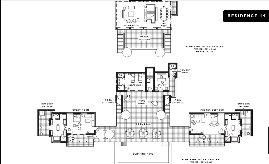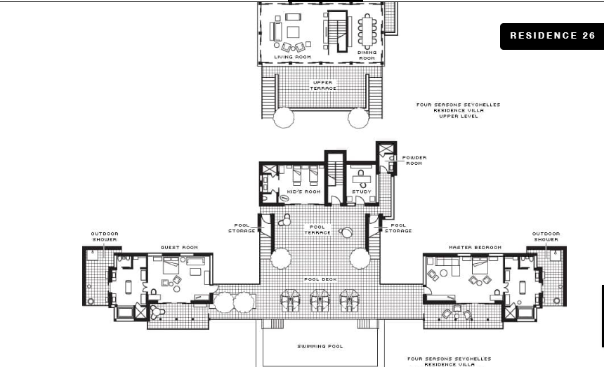 Двухуровневый номер с прямым выходом на пляж, 3 спальни: 2 двуспальные кровати king-size и 2 раздельные кровати размера queen-size, дополнительно 2 двиана-софа, 3 ванные комнаты, 3 душа под открытым небом, гостевая ванная комната, отдельная гостиная комната с диваном и обеденным столом, кухня, терраса с лежаками, персональный бассейн (12 м), открытая обеденная зона, бесплатные коктейли у бассейна подаются ежедневно, план номера;