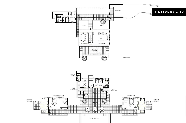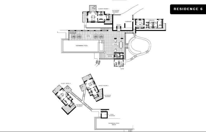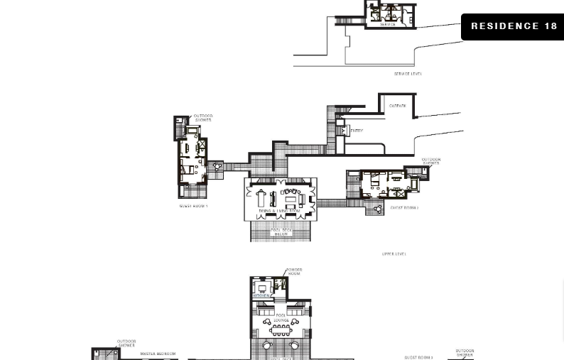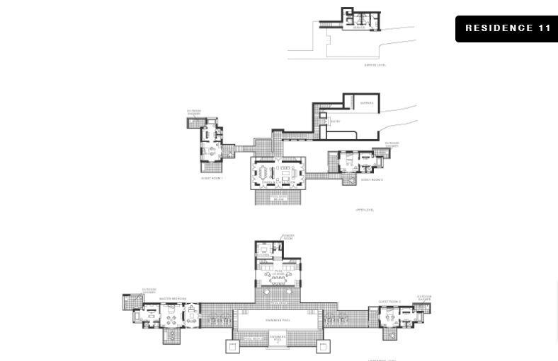 На склоне холма, 2 или 3 уровня (резиденции имеют различную планировку), 4 спальни с двуспальными кроватями king-size, 2 раскладные кровати, отдельная гостиная комната с обеденным столом, 4 ванные комнаты, гостевая ванная комната, 4 душа под открытым небом, балкон, терраса с лежаками, частный бассейн, панорамный вид на океан и сад, план номера 4, план номера 6, план номера 11, план номера 18;