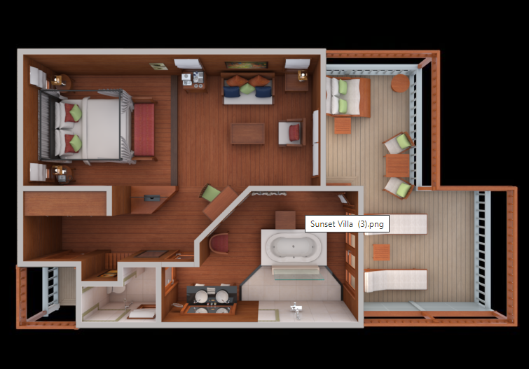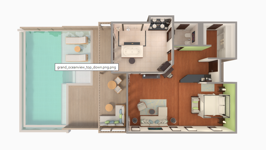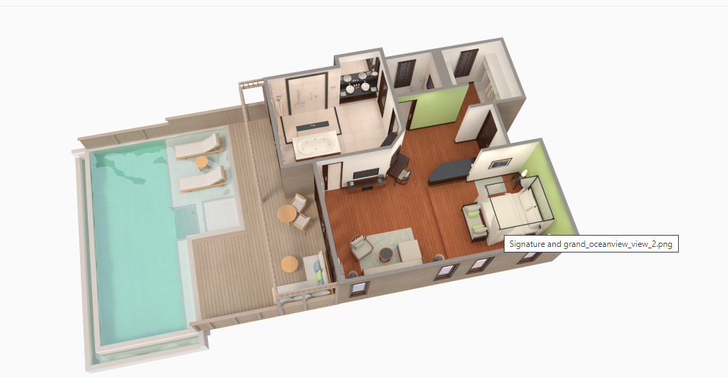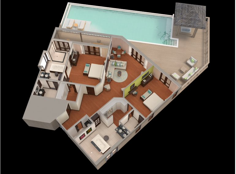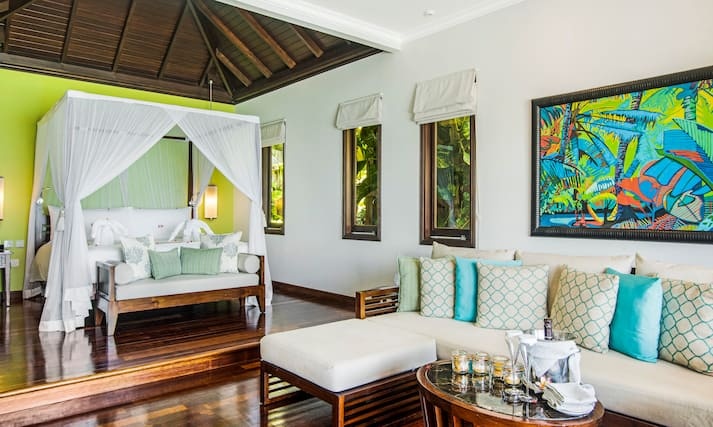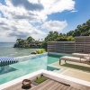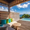 Двуспальная кровать king-size, гостиная зона с диваном, ванная комната с гидромассажной ванной и душем, меблированная терраса, частный бассейн, вид на океан и остров Силуэт, план номера;