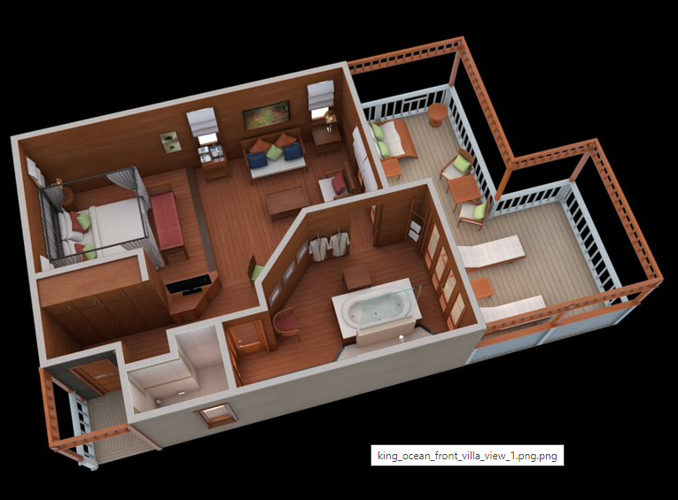 Расположены на первой линии, у океана, двуспальная кровать king-size, гостиная зона с диваном, ванная комната с гидромассажной ванной и душем, балкон, вид на океан, план номера;