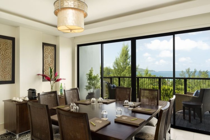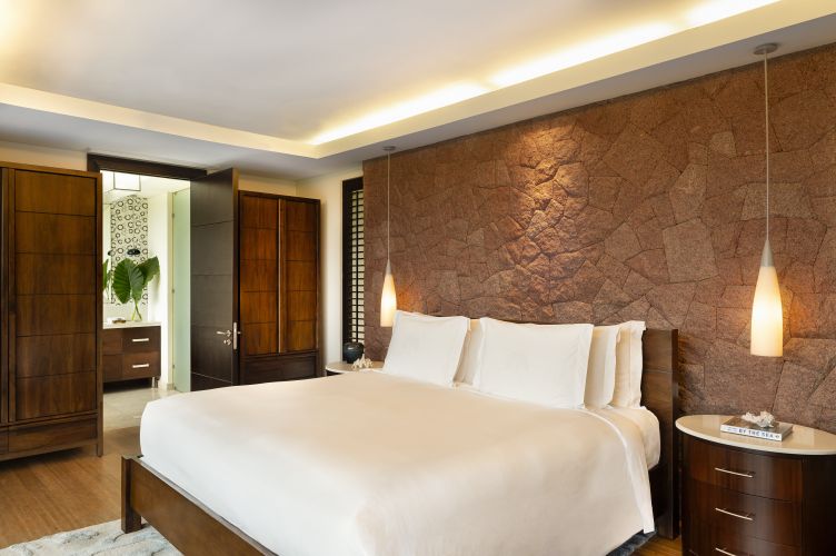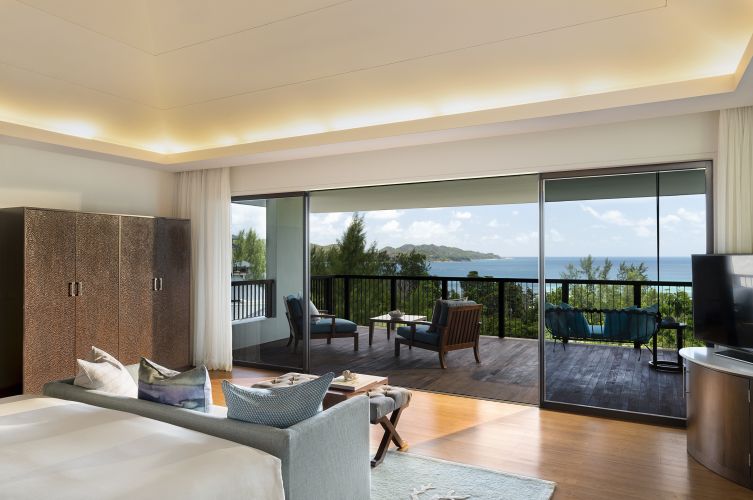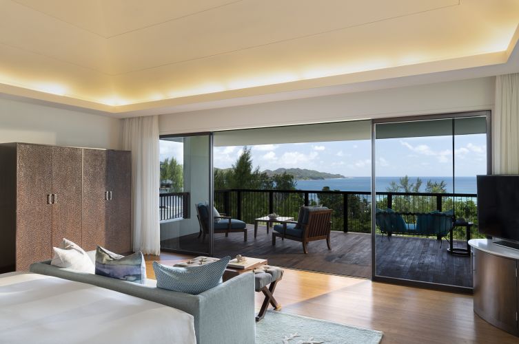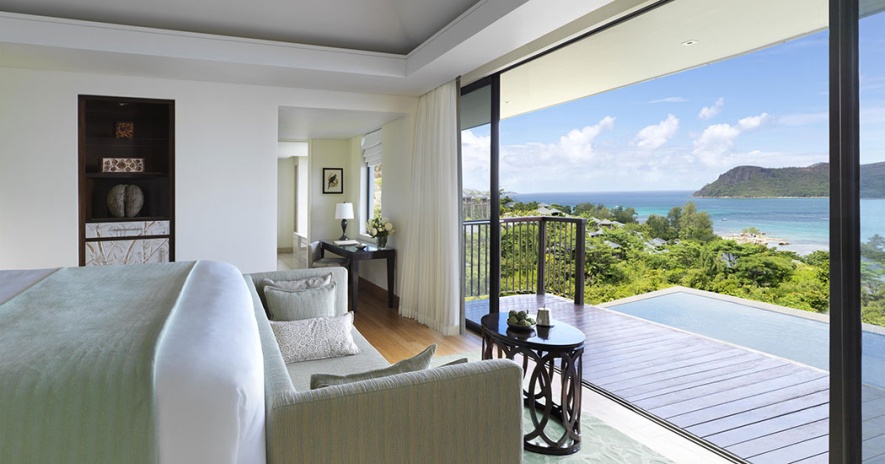 На вершине курорта с панорамным видом на океан и курорт, спальня с двуспальной кроватью king-size, отдельная гостиная комната и обеденная зона, кухня (холодильник, микроволновая печь), гардеробная,  ванная комната с ванной и душем, душ под открытым небом, терраса с лежаками и обеденным столом, частный бассейн (14 м²), услуги батлера бесплатно, безмотрные водные виды спорта бесплатно;