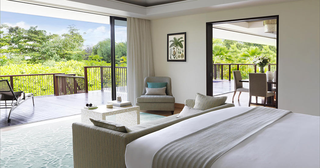 В номерах: сейф, рабочий стол, кофемашина Nespresso, набор для приготовления чая, мат для йоги, мольберт и блокнот для рисования, халат, банные принадлежности, Wi-Fi, телевизор со спутниковыми каналами, bluetooth-динамик Marshall Acton, кондиционер, телефон, мини-бар, фен, круглосуточные услуги фирменного дворецкого Raffles в виллах с 1 спальней, 2 спальнями и резиденции с 4 спальнями.