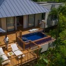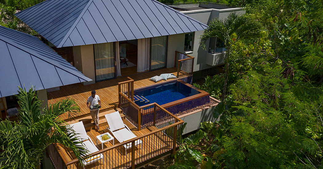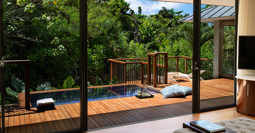 Окружены пышной растительностью, спальня с двуспальной кроватью king-size, отдельная гостиная комната и обеденная зона, кухня (холодильник, микроволновая печь), гардеробная,  ванная комната с ванной и душем, душ под открытым небом, терраса с лежаками и обеденным столом, частный бассейн (14 м²), вид на океан, услуги батлера бесплатно, безмотрные водные виды спорта бесплатно;