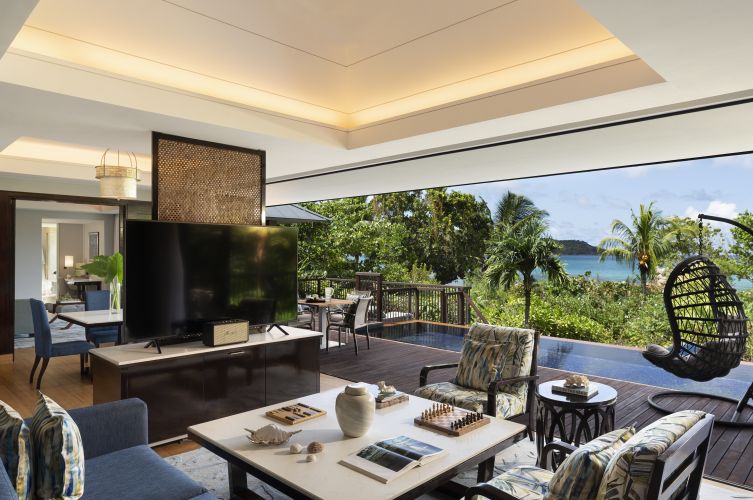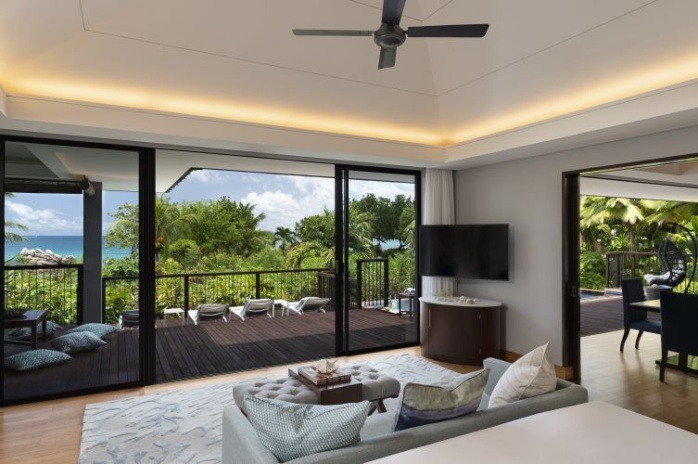 2 спальни  с двуспальными кроватями king-size, отдельная гостиная комната, 2 ванные комнаты, меблированная терраса с лежаками, гардеробная, душ под открытым небом, частный бассейн (24 м²), вид на океан, услуги батлера бесплатно, безмотрные водные виды спорта бесплатно;