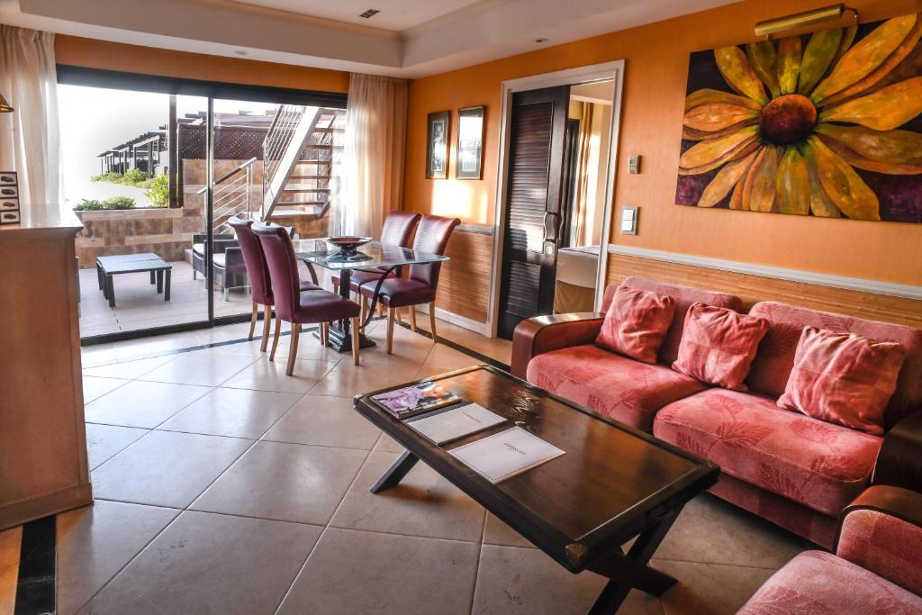 Спальня с двуспальной или 2 односпальными кроватями, отдельная гостиная комната с диваном, дополнительной кроватью для 3-го человека, мини-кухней и обеденной зоной, ванная комната с гидромассажной ванной, меблированная терраса, тапочки, вид на море и/или бассейн;