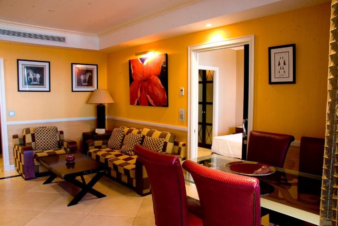 2 спальни (двуспальная и 2 односпальные кровати) отдельная гостиная комната с мини кухней и обеденной зоной, дополнительная кровать для 5-го человека ставится в гостиную, 2 ванные комнаты (одна с гидромассажной ванной), меблированная терраса, вид на море и/или бассейн;