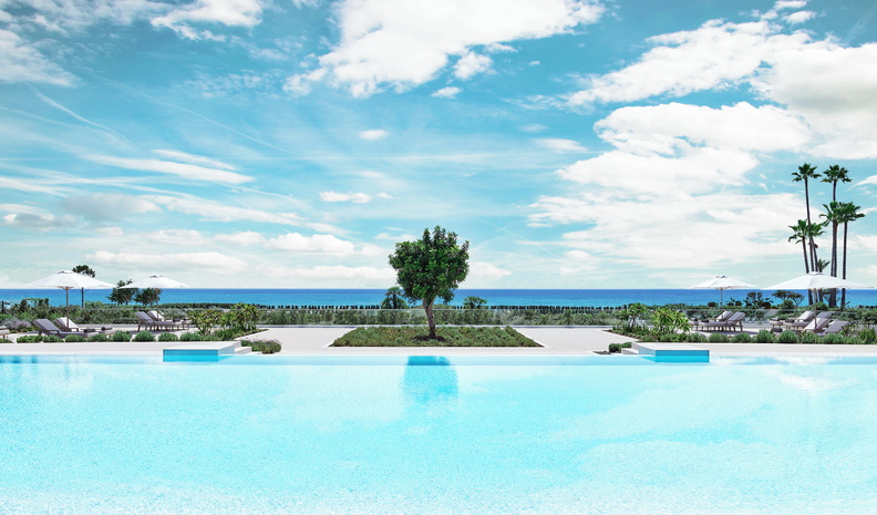 2 спальни, гостиная комната, 2 ванные комнаты с ванной и душевой кабиной, меблированная терраса, частный бассейн с подогревом, вид на море, план номера.