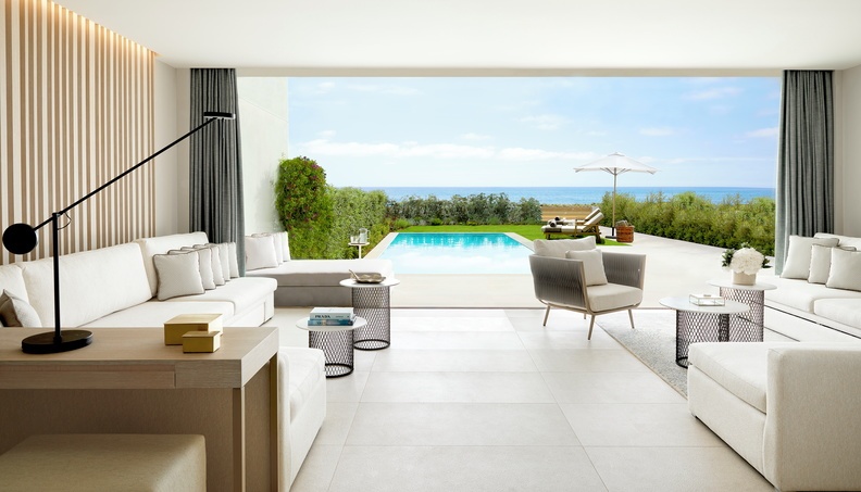 Просторный номер открытой планировки, двуспальная кровать, гостиная зона с диваном-софа, ванная комната с ванной и душевой кабиной, меблированная терраса, частный подогреваемый бассейн, вид на море, план номера;
