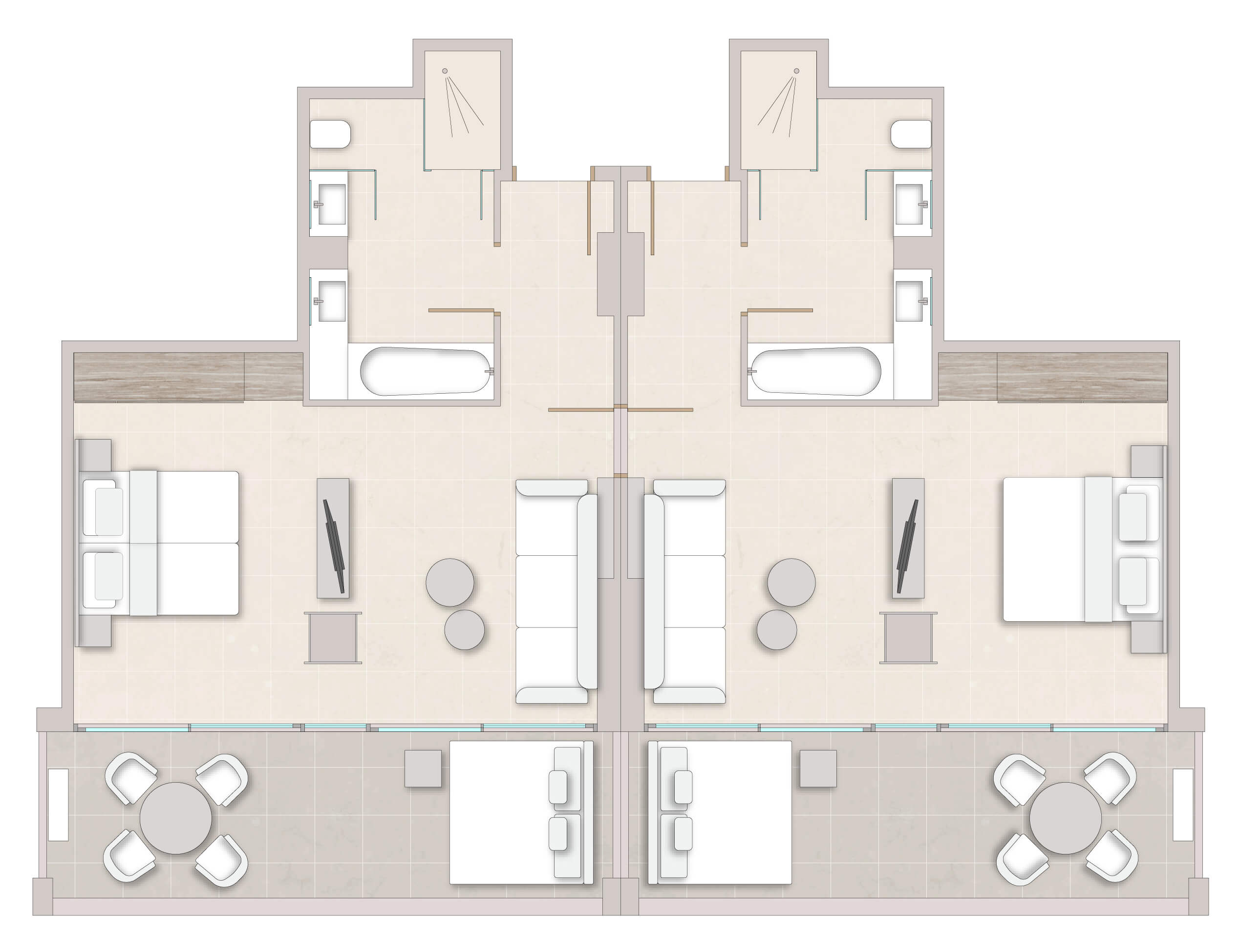 Просторный семейный номер, состоящий из двух номеров Junior Suite, объединённых межкомнатной дверью, две ванные комнаты, каждая из которых – с ванной и душевой кабиной, меблированный балкон, вид на бассейн/море, план номера;