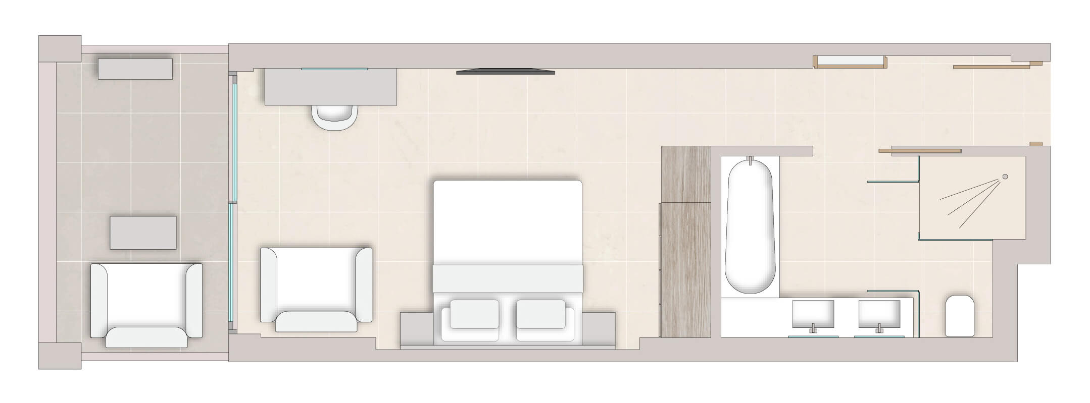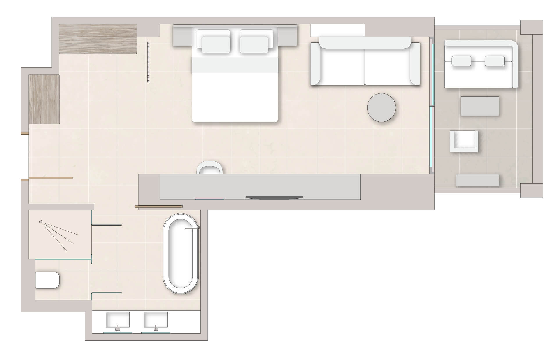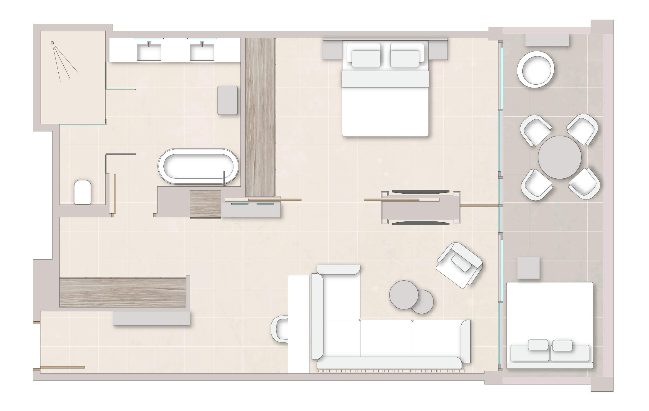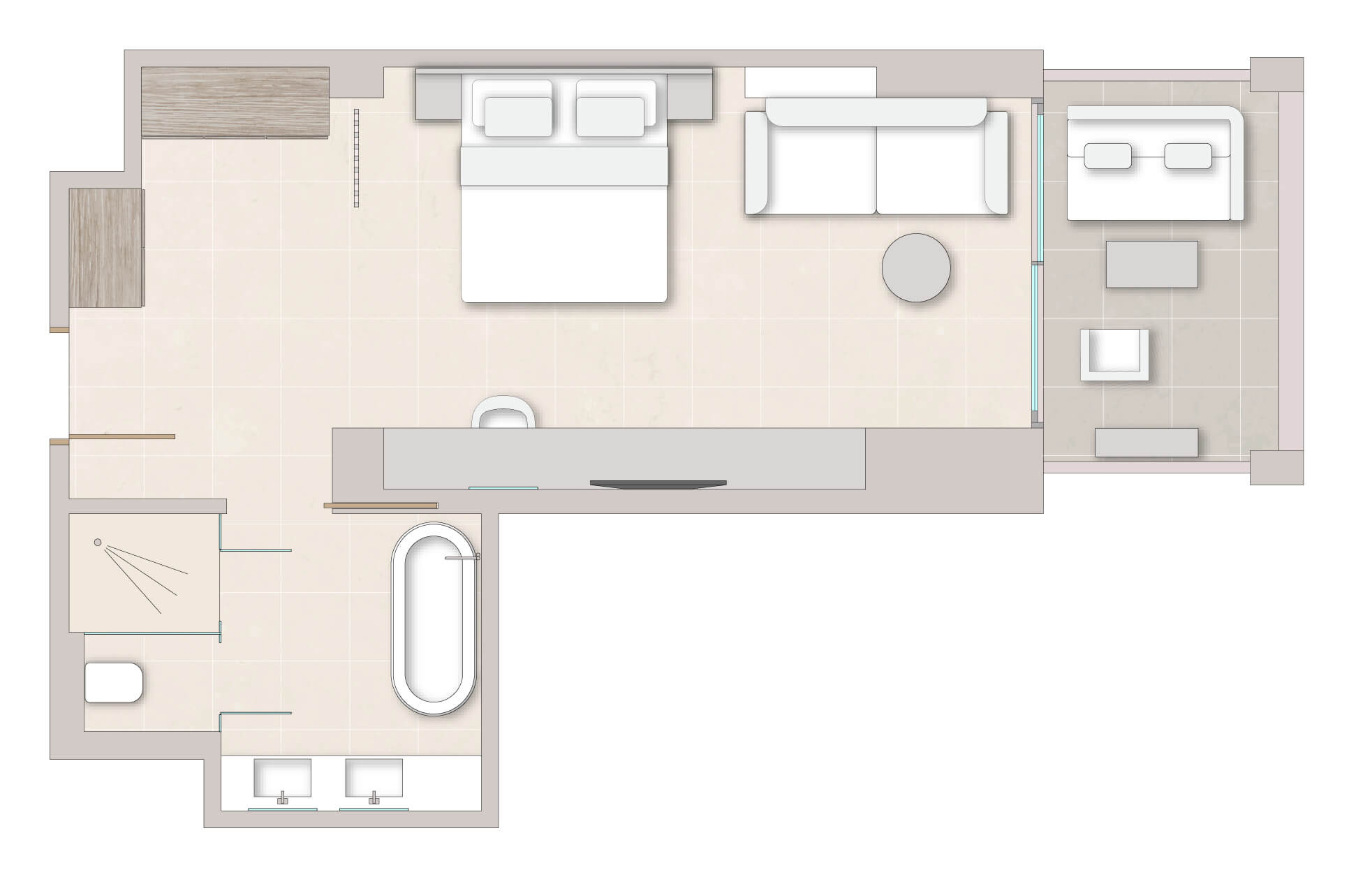 Спальня с двуспальной кроватью, отдельная гостиная комната с диваном, ванная комната с ванной и душевой кабиной, меблированный балкон или терраса, боковой вид на море, план номера;