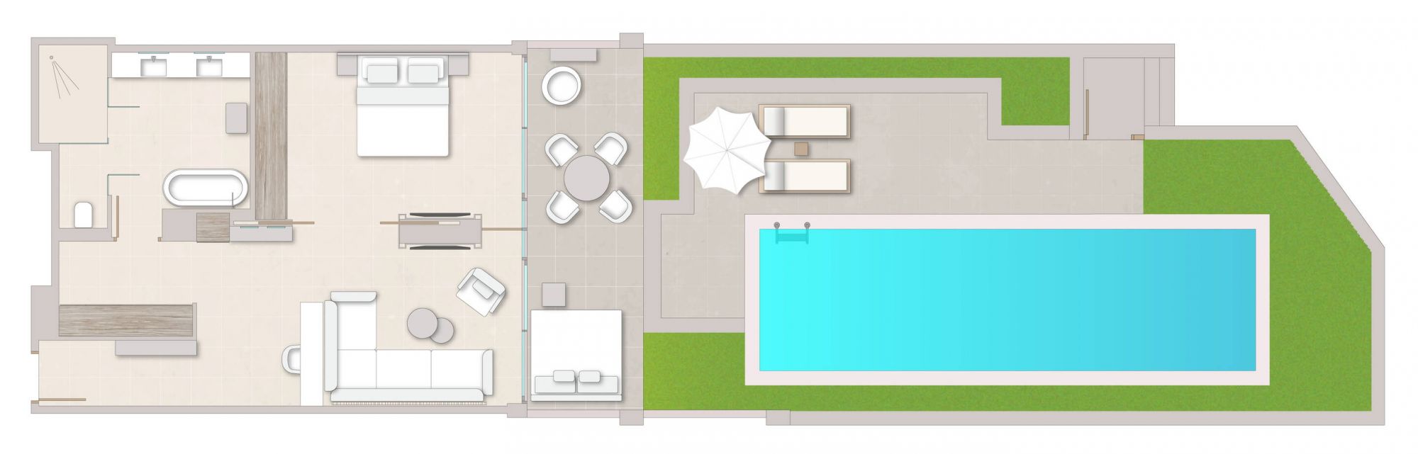 Спальня с двуспальной кроватью, гостиная комната с диваном, ванная комната с ванной и душевой кабиной, меблированная терраса, частный подогреваемый бассейн, вид на сад, план номера;