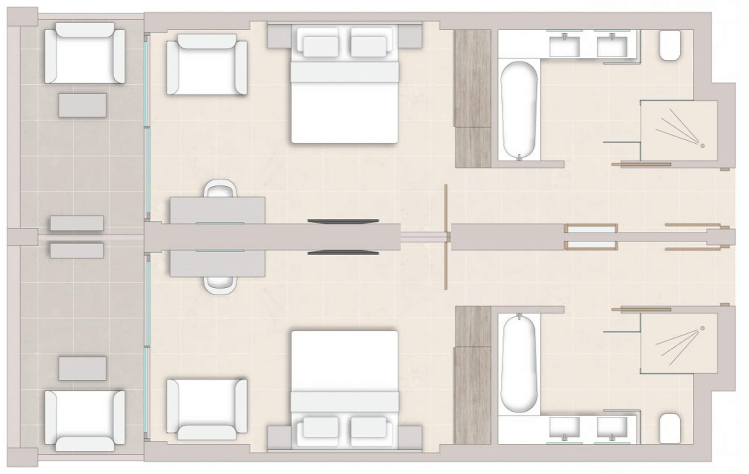 Просторный семейный номер, состоящий из двух номеров супериор, объединенных межкомнатной дверью, с меблированным балконом, двумя ванными комнатами, каждая из которых – с ванной и душевой кабиной, вид на бассейн, план номера;