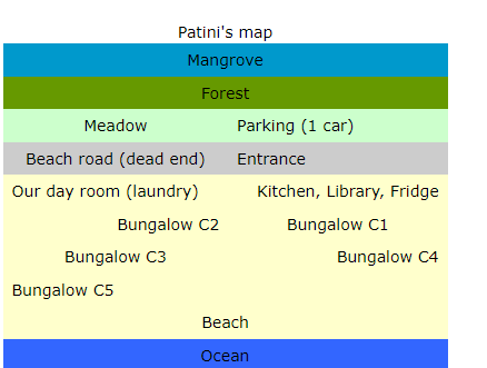 5 бунгало стоят в три ряда: C1 и C2 расположены в третьем ряду и они стоят на сваях, поэтому веранда выше, чем в других бунгало, C3 и C4 стоят во втором ряду, C5 стоит в первом ряду, ближайшем к пляжу.