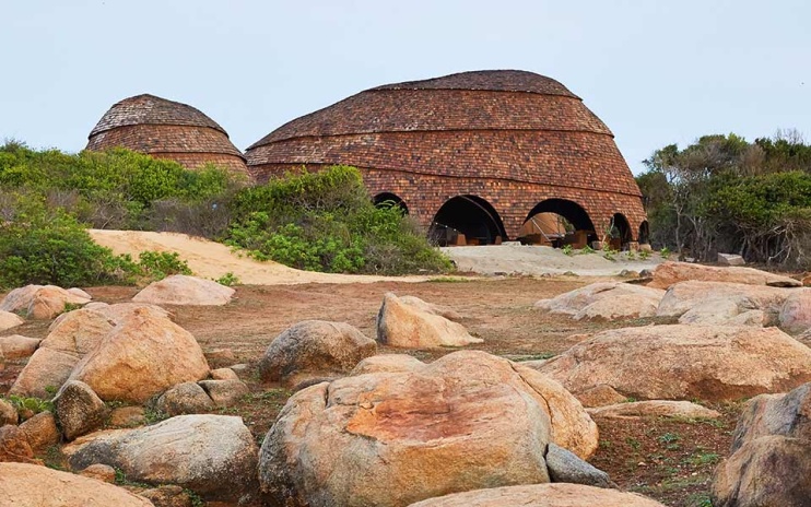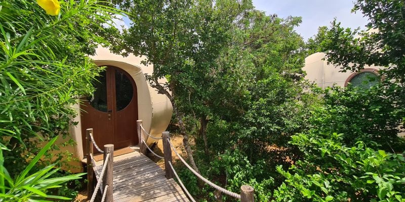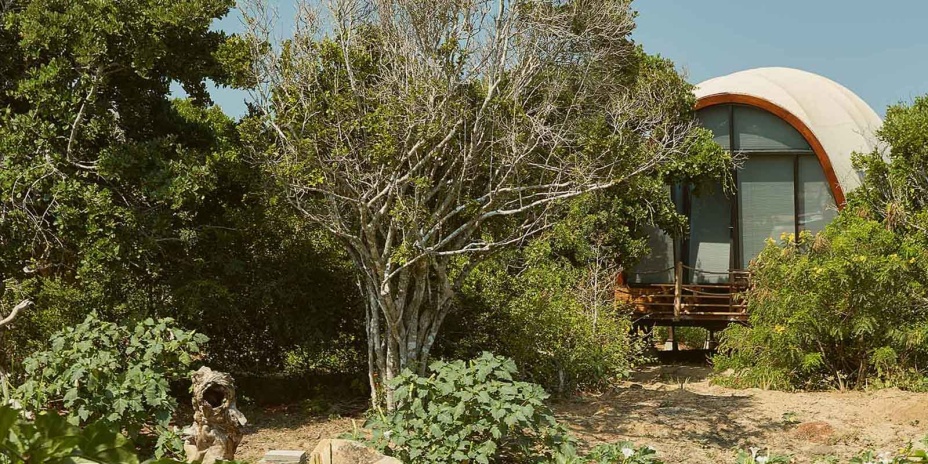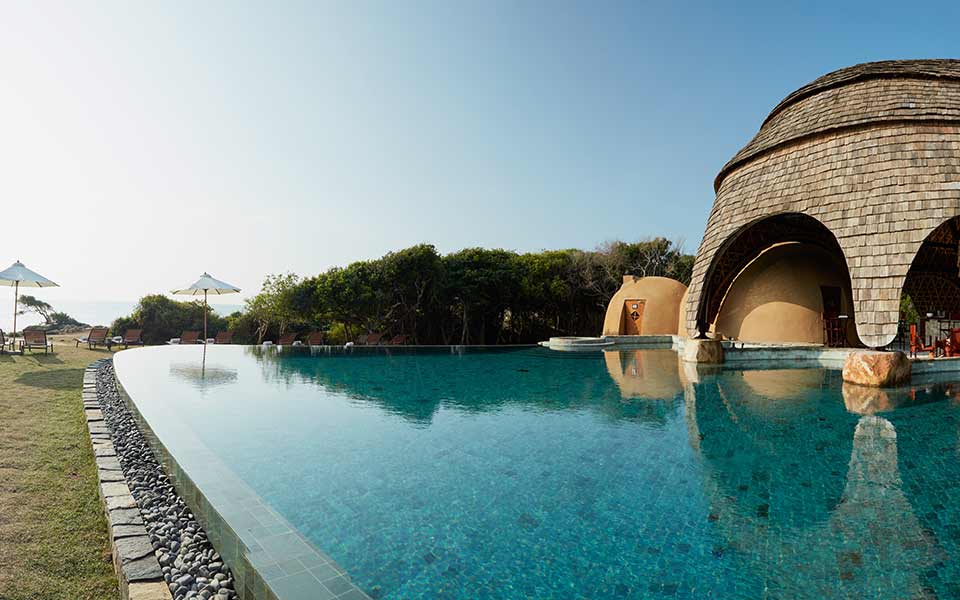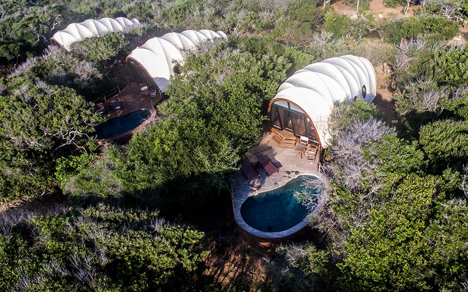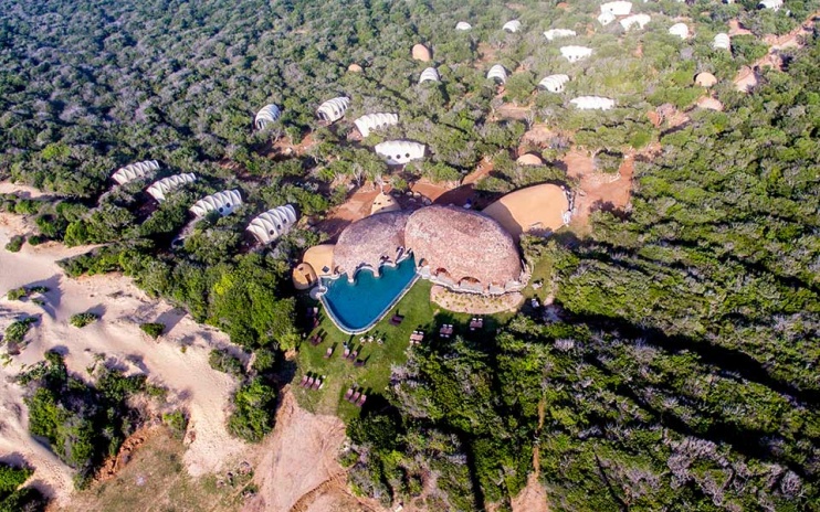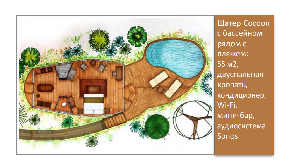Главные здания отеля выполнены из бамбука, а шатры уникальной формы, названные Cocoon и Urchin (Коконы и Морские ежи), представляют собой номера под тентовым полотном, предлагающие самые современные удобства, включая кондиционер.