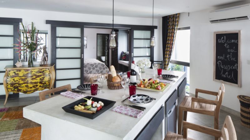 Небольшой бутик-отель Owl and the Pussycat расположен рядом с пляжем в курортном районе Хиккадува. Номера расположены в 4-х трёхэтажных красочных зданиях: синем, бежевом, розовом и жёлтом.