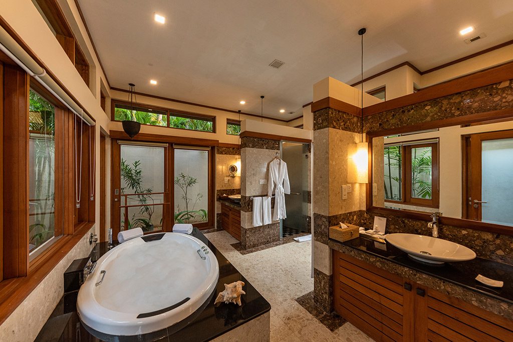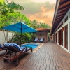 Одноэтажный павильон, 2 спальни: двуспальная кровать king-size и 2 односпальные кровати, отдельная гостиная комната с обеденной зоной, мини-кухня, 2 ванные комнаты, терраса с частным бассейном.