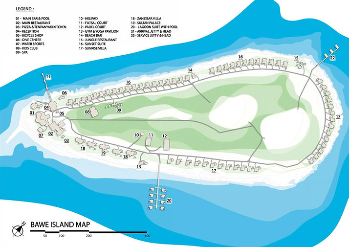 Курорт Bawe Island расположен острове Баве площадью более 30 гектаров, на котором расположено всего 70 эксклюзивных вилл среди пышной и дикой природы, все виллы оснащены частными бассейнами. К услугам гостей открытый бассейн, спа-центр, рестораны, центр водных видов спорта и дайвинга, а также тренажёрный зал.
