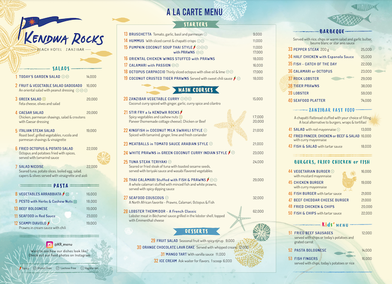 Тематические номера (Theme Room) представлены в четырех вариантах: Historical (исторические номера) обставлены антикварной мебелью Занзибара, а их названия и дизайн отсылают к увлекательной истории побережья Суахили; Coral Stone (отдельные или парные бунгало) предлагают уединенный отдых среди пышных тропических садов, The Arabia и Africa Themed Rooms примыкают к главному зданию - террасы нижнего этажа с видом на сад в центральном внутреннем дворе с фонтаном-водопадом, а с балконов верхнего этажа открывается вид на весь пляж; Beach House находится ближе всего к пляжу и рядом с бассейном.