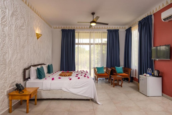 В номерах: набор для приготовления чая/кофе, фен, телевизор со спутниковыми каналами, мини-холодильник, сейф, Wi-Fi, москитная сетка, потолочный вентилятор, кондиционер, утюг и гладильная доска (по запросу).