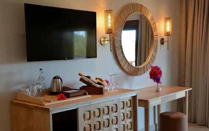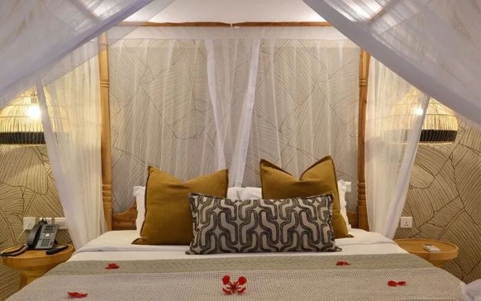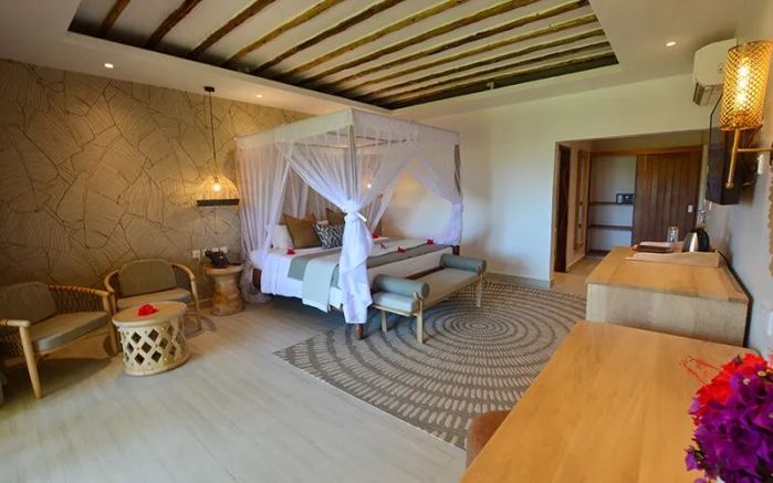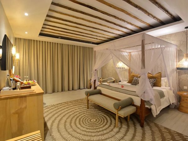 Номера отеля оформлены в африканском стиле и располагаются в 2-х уровневых блоках, а также есть 4 отдельных пляжных сьюта с джакузи.