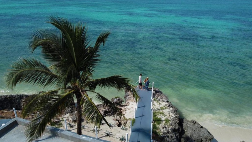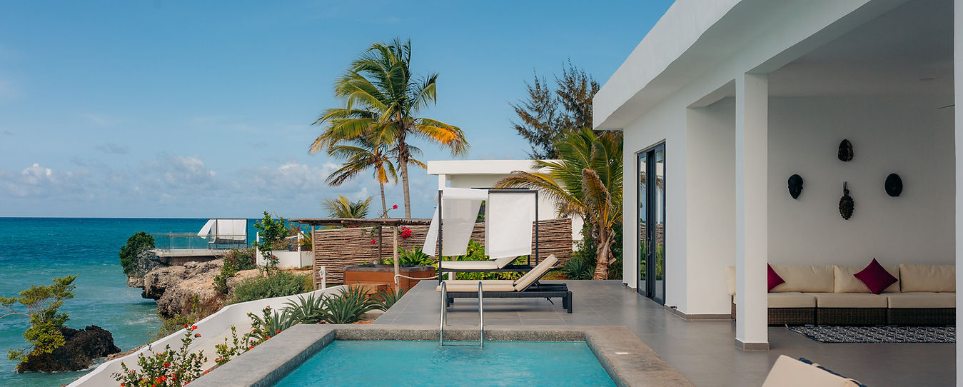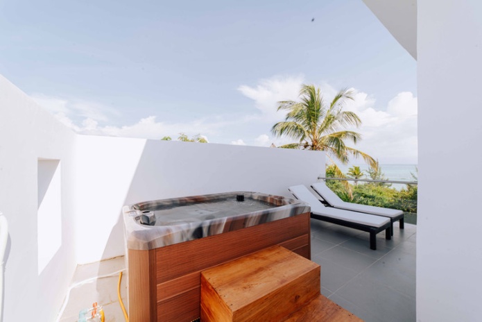 В 80 м от океана, в 110 м от основных бассейнов и пляжа, двухэтажная вилла, 2 спальни с двуспальными кроватями king-size, отдельная гостиная комната, мини-кухня, 2 ванные комнаты, терраса на втором этаже с гидромассажной ванной и зоной отдыха, частный бассейн, вид на океан, план номера.