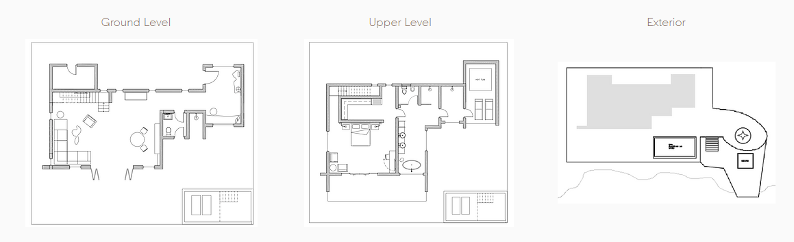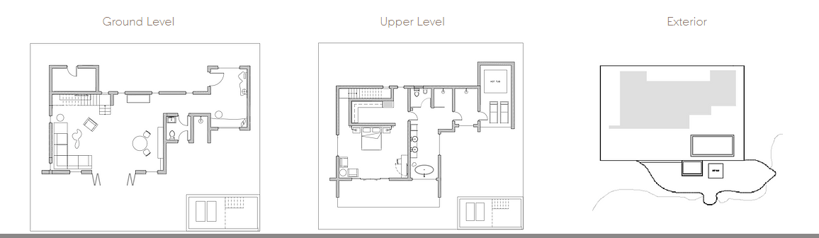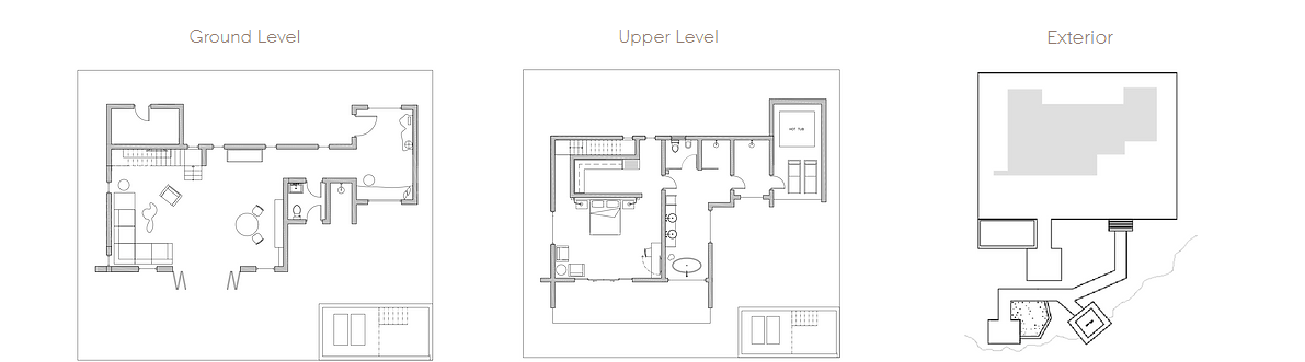 Находится в 194 м от основных бассейнов и пляжа, одноэтажная вилла, спальня с двуспальной кроватью king-size, отдельная гостиная комната с диваном, мини-кухня, ванная комната с гидромассажной ванной и душем, душ под открытым небом, терраса с лежаками, частный бассейн, подвешенная над водой палуба у скалы, вид на океан, план номера;