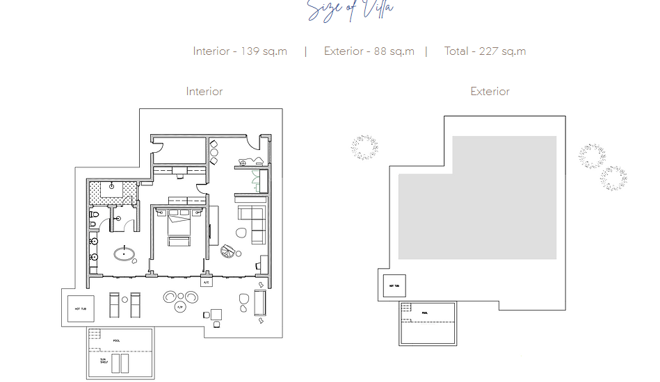 Находится в 180 м от основных бассейнов и пляжа, расположена выше других виллы, в 70 м от океана, одноэтажная вилла, спальня с двуспальной кроватью king-size, отдельная гостиная комната, мини-кухня, ванная комната с гидромассажной ванной и душем, душ под открытым небом, меблированна терраса, частный бассейн, ландшафтный сад и вид на океан, план номера;