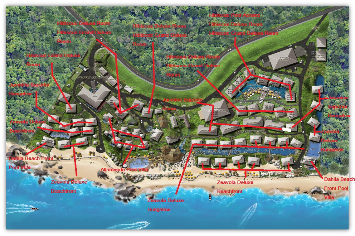 Номера оформлены в тёплом тайском стиле и окружены зеленью. Варианты размещения включают как стандартные комнаты, так и бунгало и виллы с частными бассейнами. Во всех номерах есть балкон или терраса, откуда открываются виды на сад, бассейн или море.