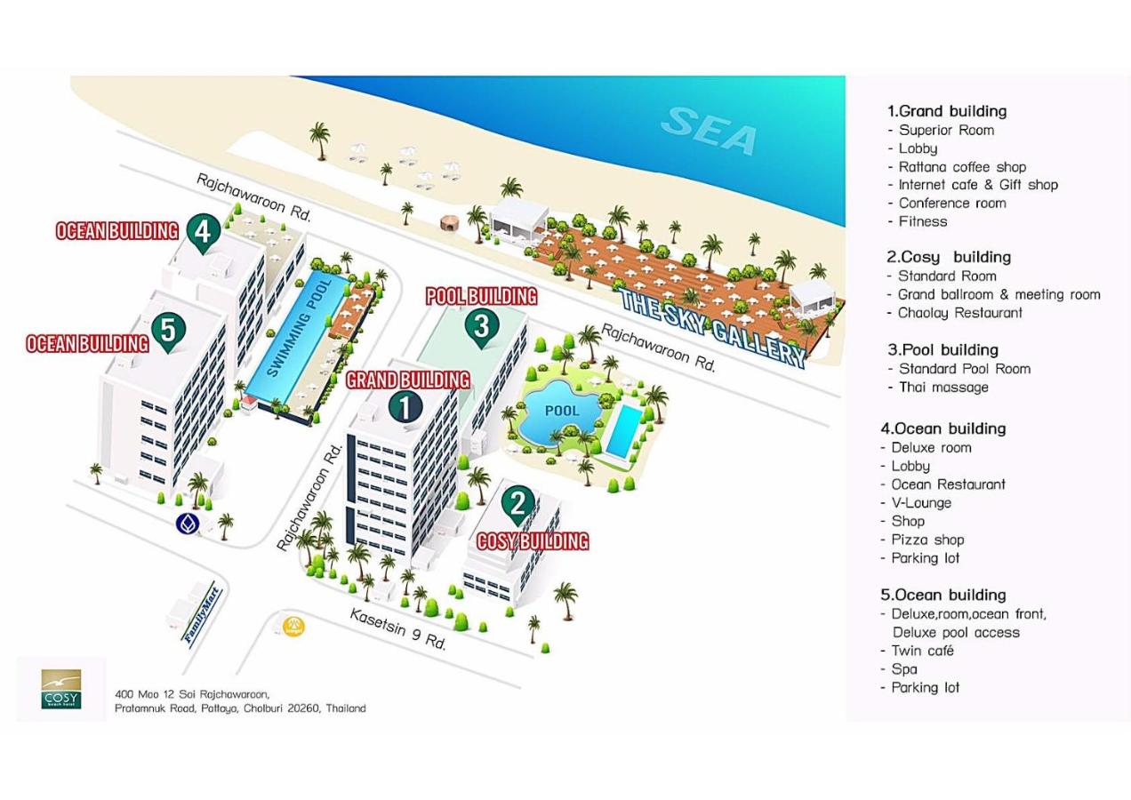 Cosy Beach расположен в 100 м от пляжа и состоит из четырёх корпусов (5 зданий ): Cosy Wing (номера без балкона), Pool Wing, Grand Wing и Ocean Wing. На территории 2 открытых бассейна, тренажёрный зал, а также детская игровая комната.