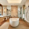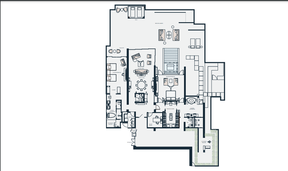 2 спальни с кроватями king-size, отдельная гостиная комната с диваном и обеденной зоной, 2 ванные комнаты (одна с ванной и душем, другая с душем), гостевой туалет, 2 гардеробные, меблированный балкон, вид на бассейн, план номера;
